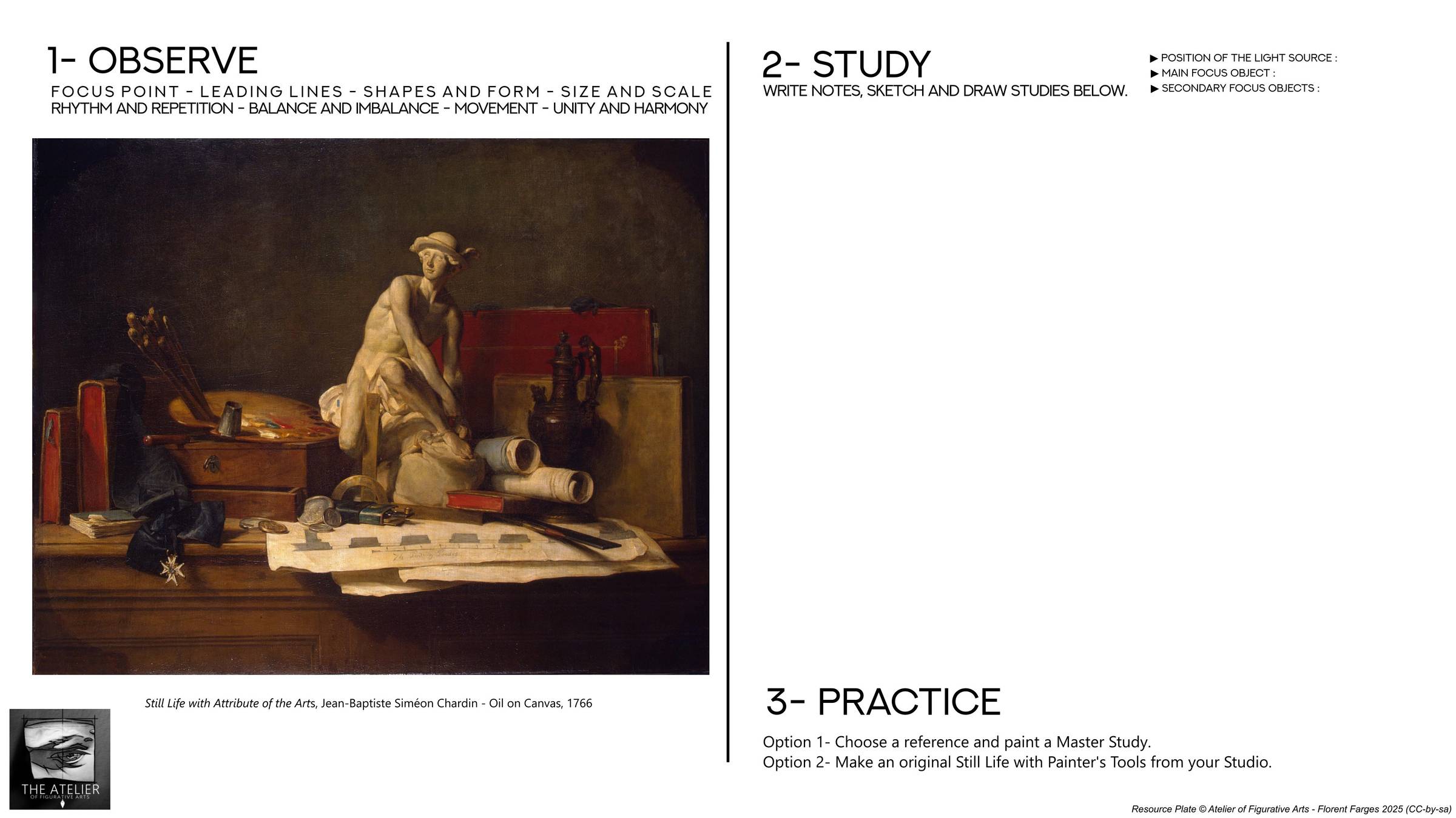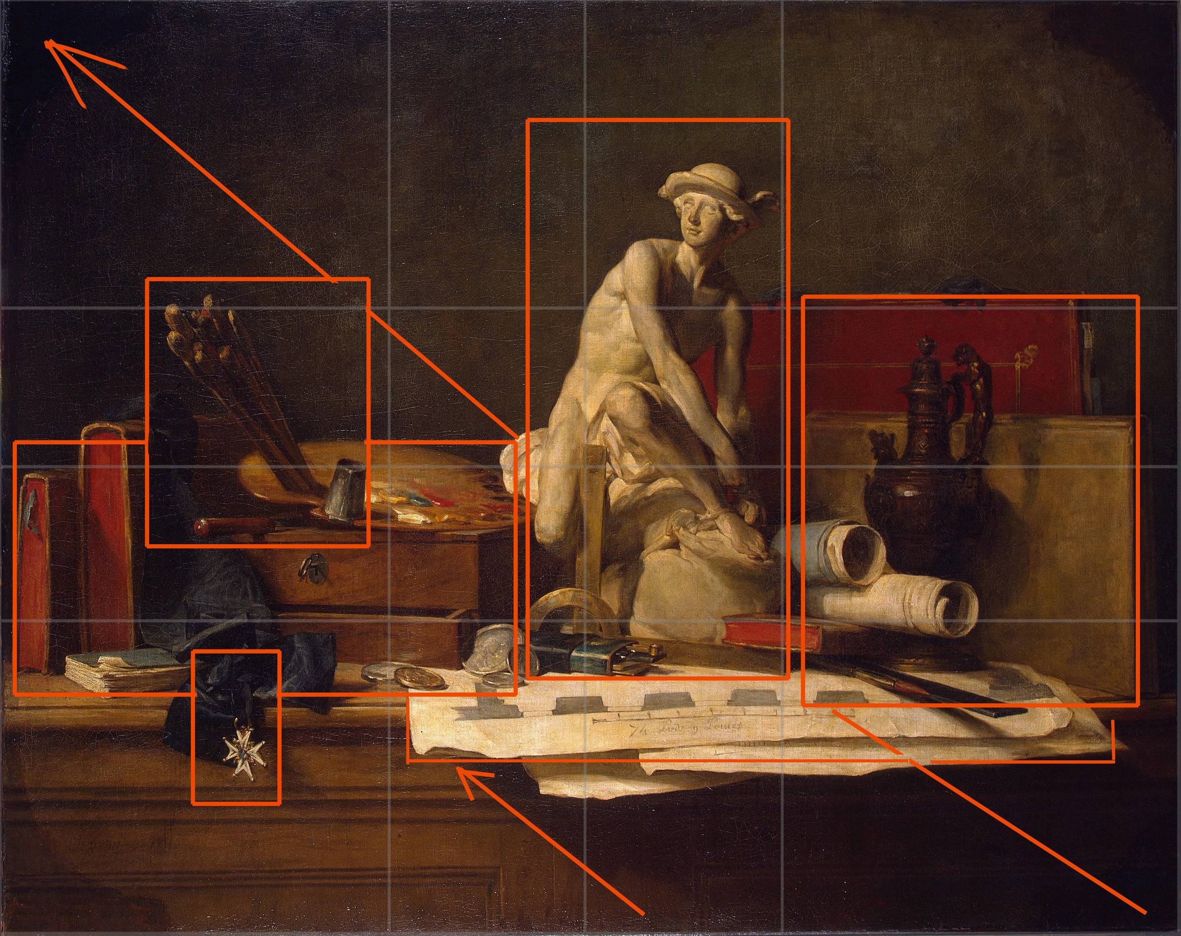 When you look at Chardin’s still life, notice first the architecture of the painting. Nothing is random. Each object—the books, palette, plaster cast, brushes—sits with purpose.