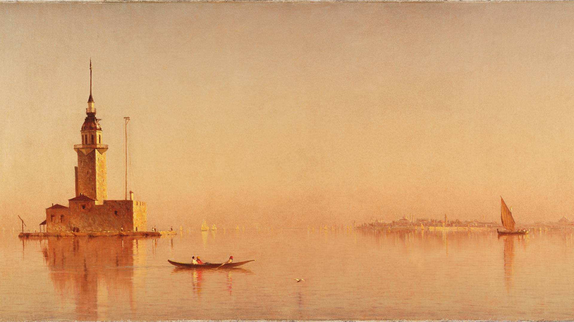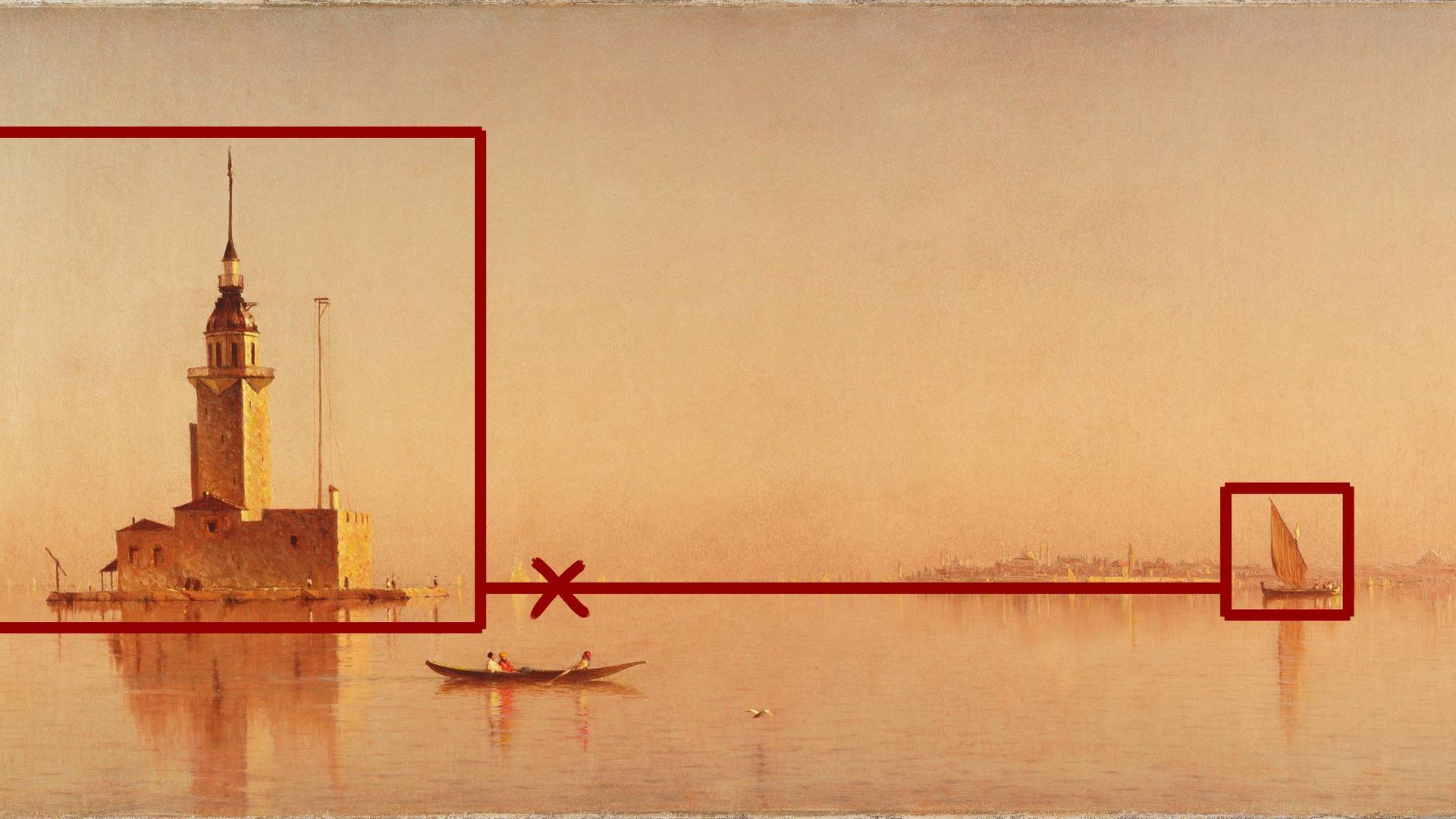 The eye first lands on Miranda, but then drifts across the painting, following her gaze toward the tiny boat on the horizon. The tension between the large mass (the figure) and the smaller focal interest (the distant sail) creates rhythm. It’s actually a case of extreme asymmetrical balance because, here the big subject is massive compared to the small one but you can find other cases in which this idea is used more subtly like this paintings by Leon Germain or Sanford Robinson.