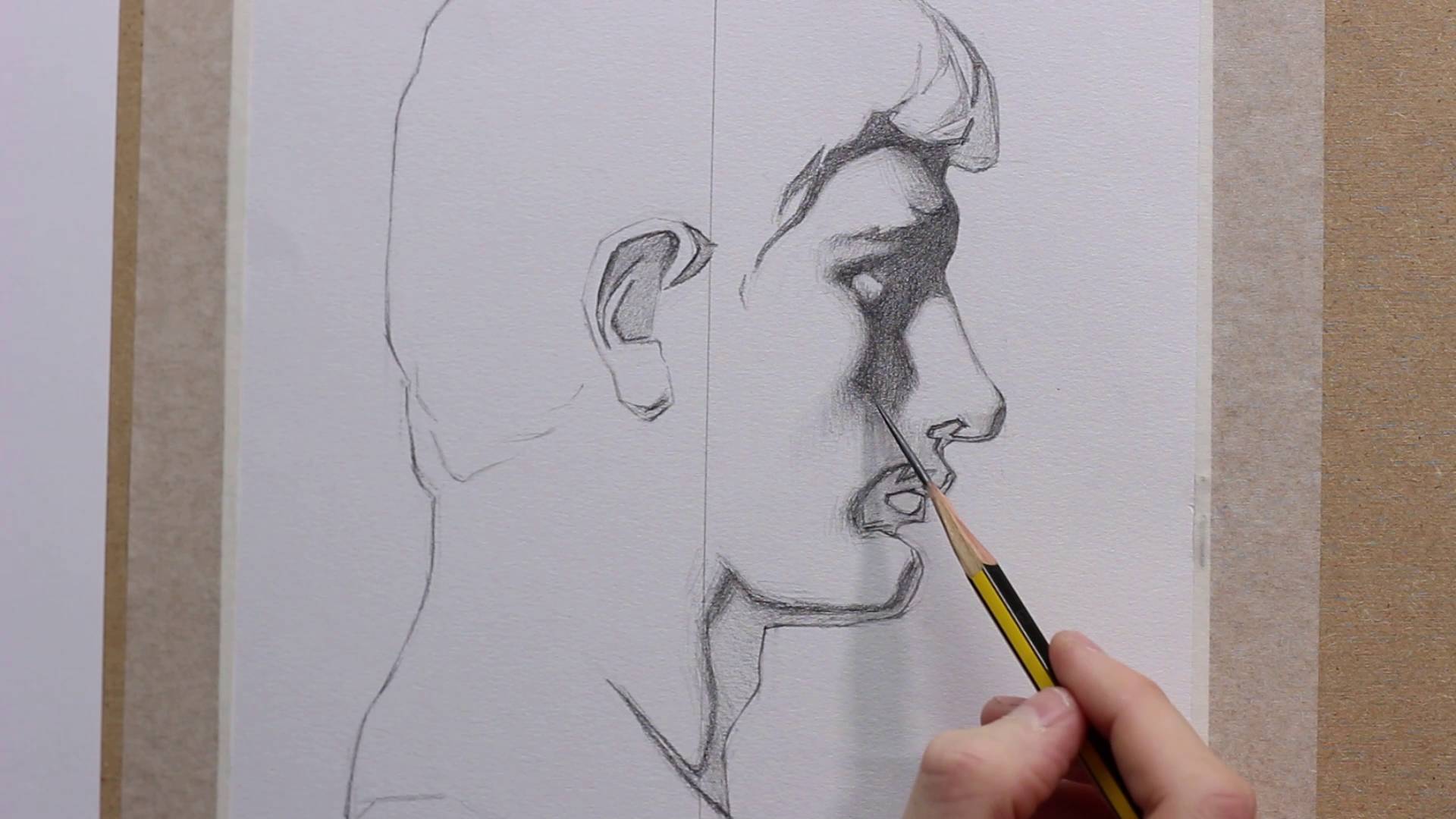 Shadow shapes carve the form for you. They give you the “big puzzle pieces” before you worry about the smaller ones. This is another reason why we start with darks: because the shadow mass functions like a blueprint: if the shadow is correct, the underlying form is almost guaranteed to read correctly later.